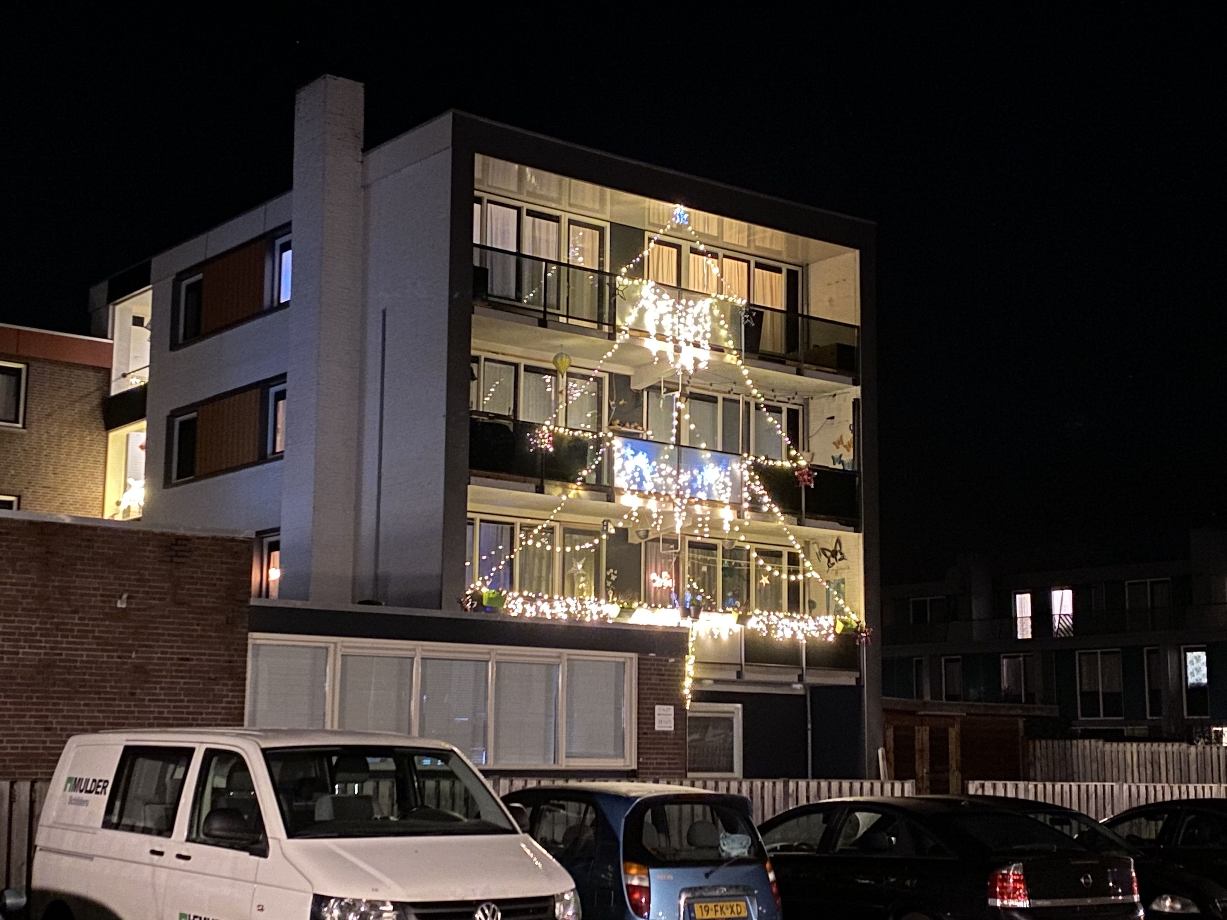 Een flat bij de Gelderse Hoek wordt in deze donkere dagen opgelicht. Met een lichtslang in de vorm van een kerstboom versierden de bewoners de buitenkant van het gebouw. "Het is vooral voor de gezelligheid, dat is belangrijk in deze tijd."