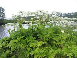 Proef met verkeersborden van oud plastic en reuzenberenklauw