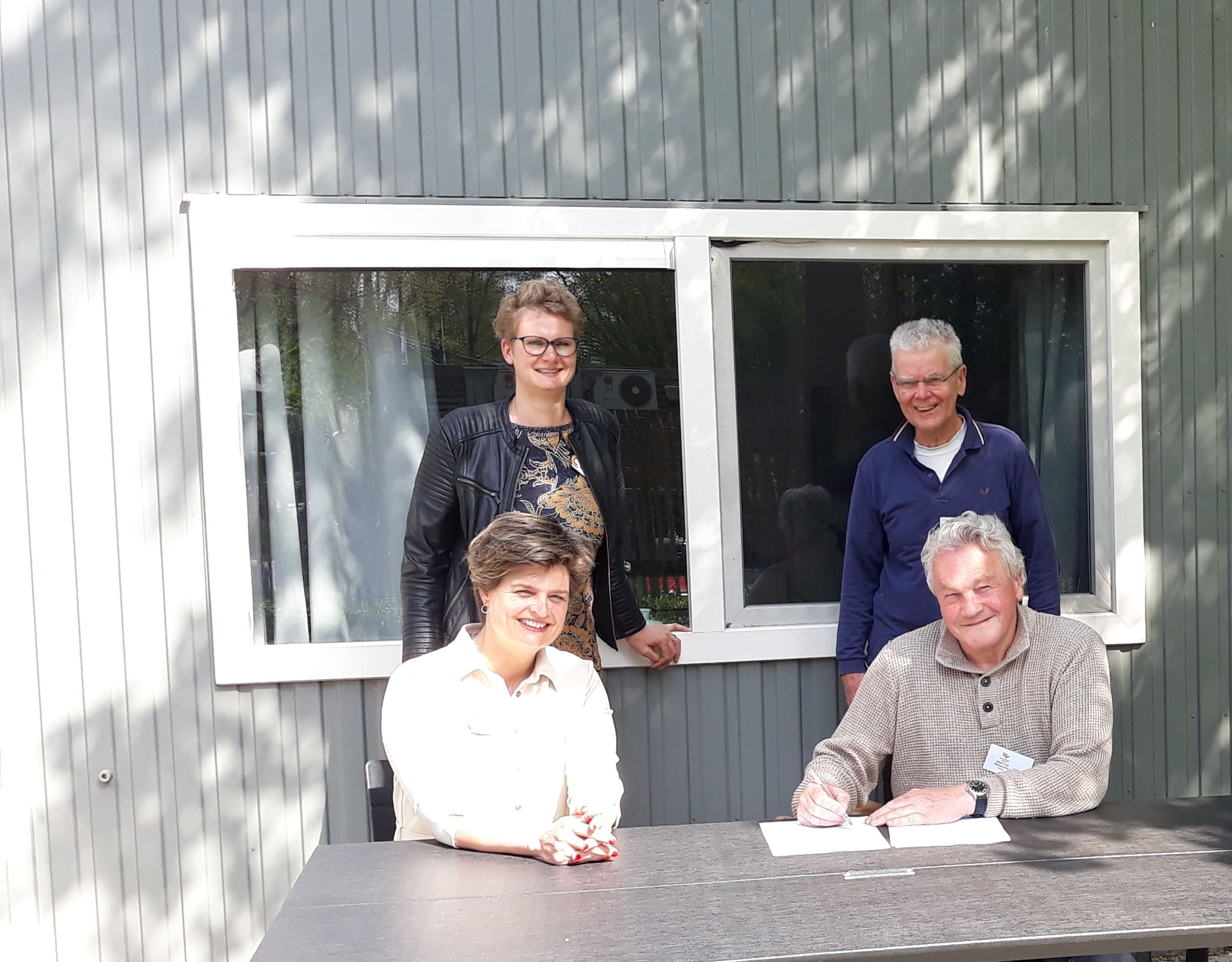 Op de foto: staand Joyce Plasschaert (hoofd zorg en welzijn Coloriet Wijkzorg) en Evert Marseille (Respijthuis Lelystad); zittend Paula Roorda (directeur Coloriet Wijkzorg) en Albert Kok (Respijthuis Lelystad).