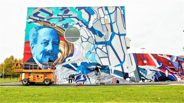 Op het linkerdeel van het gebouw is een gigantische afbeelding te zien van Cornelis Lely, de grondlegger van Flevoland. Karski: "We proberen met dit werk eigenlijk het ontstaan van Flevoland uit te beelden." Aan het einde van het werk is een grote otter te zien. "Mensen reageren heel leuk en geven ons veel complimenten." Bijzonder detail: een vrouw uit de buurt die niet lang meer heeft, mag een stukje meeschilderen. "Zodat haar kinderen en kleinkinderen later kunnen zeggen: hier heeft mijn moeder of oma aan meegewerkt."