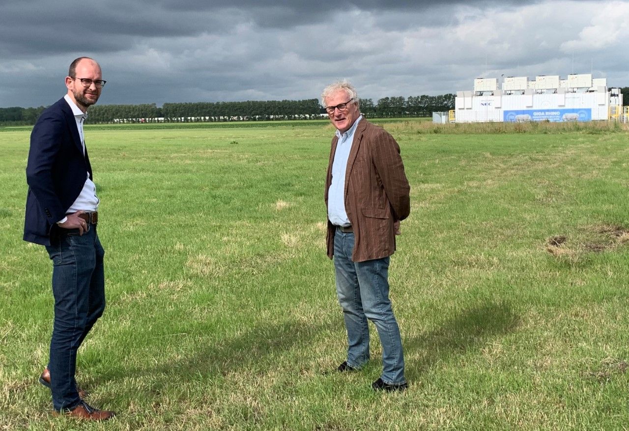 Op de foto Fredrik Troost (Eneco) en Ruud Nijs (GIGA Storage) op het bouwterrein, met op de achtergrond Rhino.